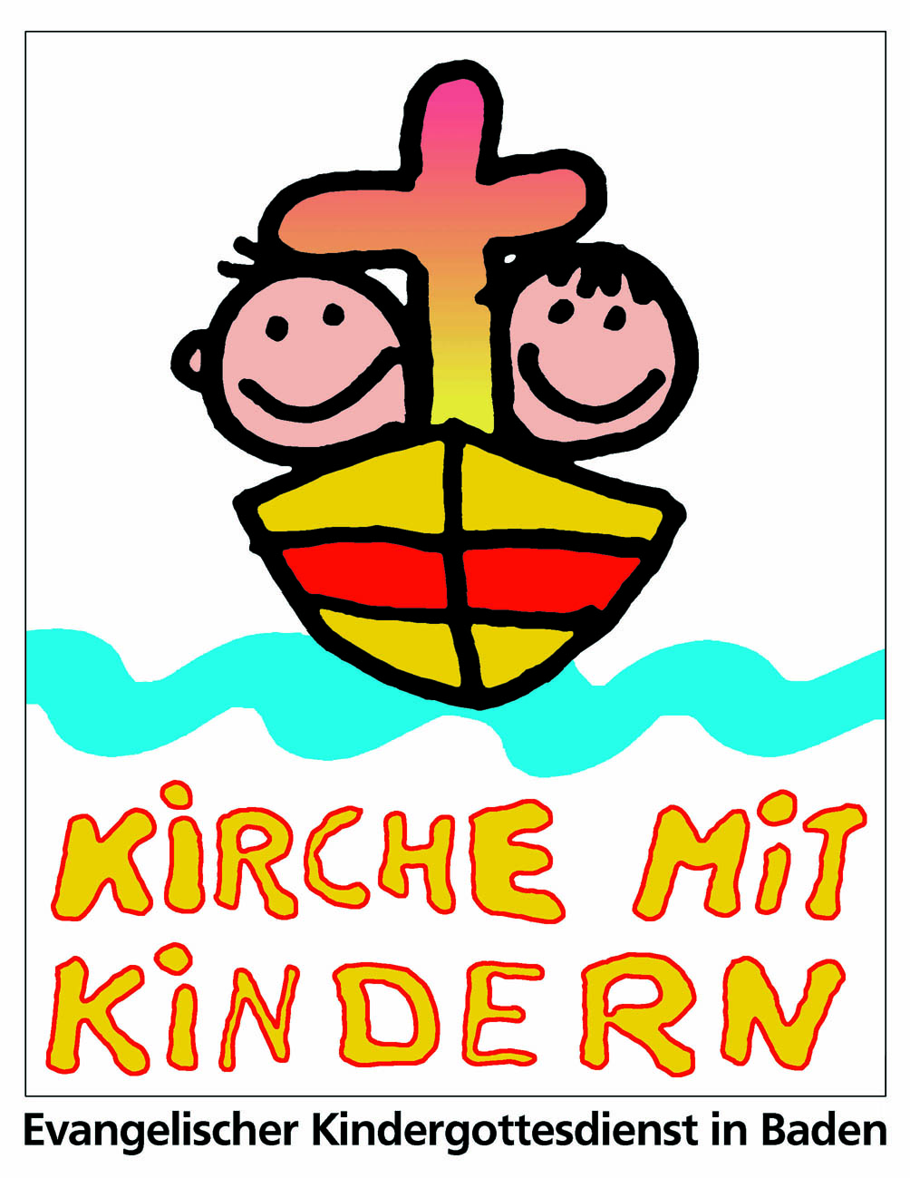 Schiff, Kreuz, 2 Kinder, Wasserwelle, Text: Kirche mit Kindern